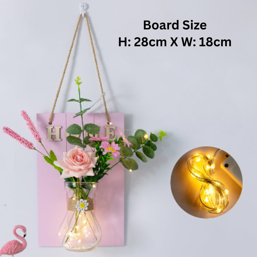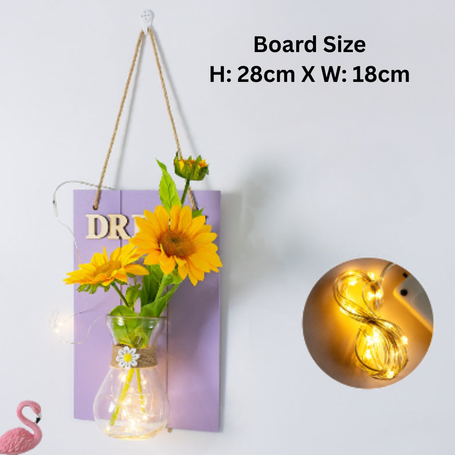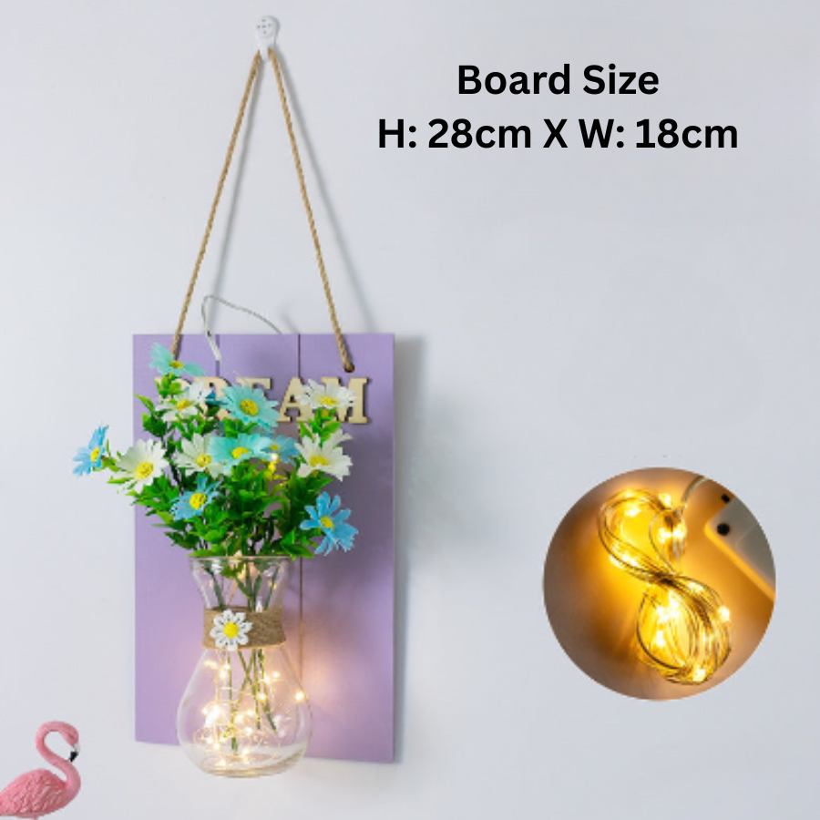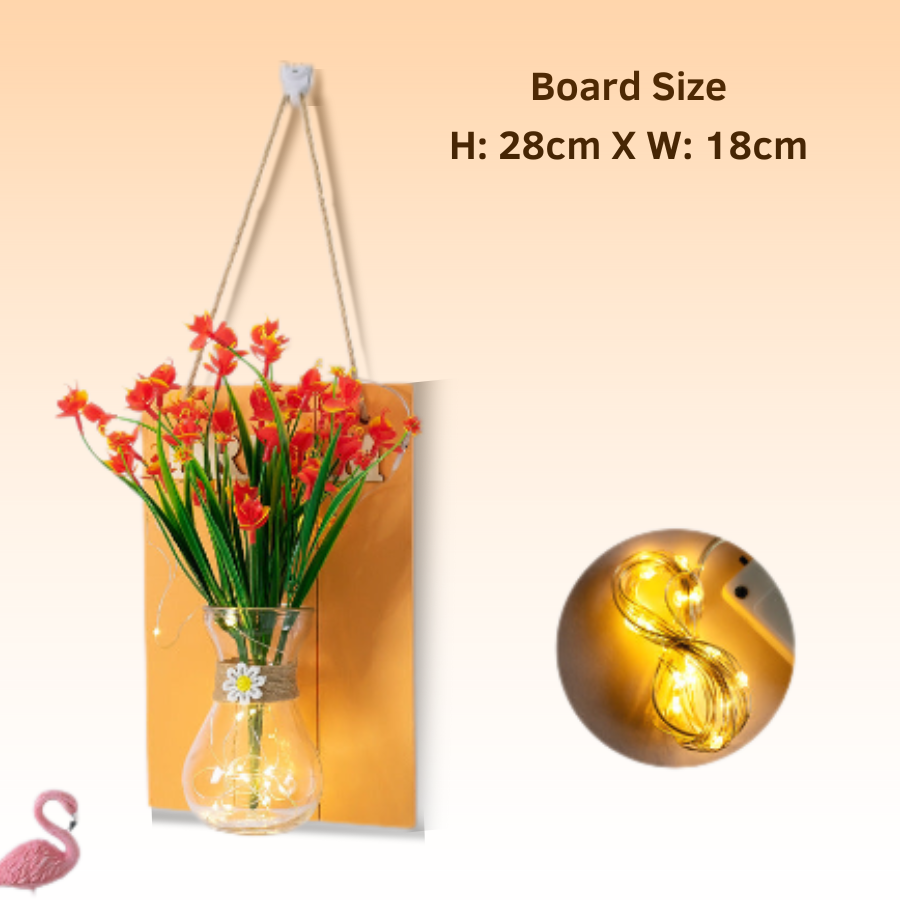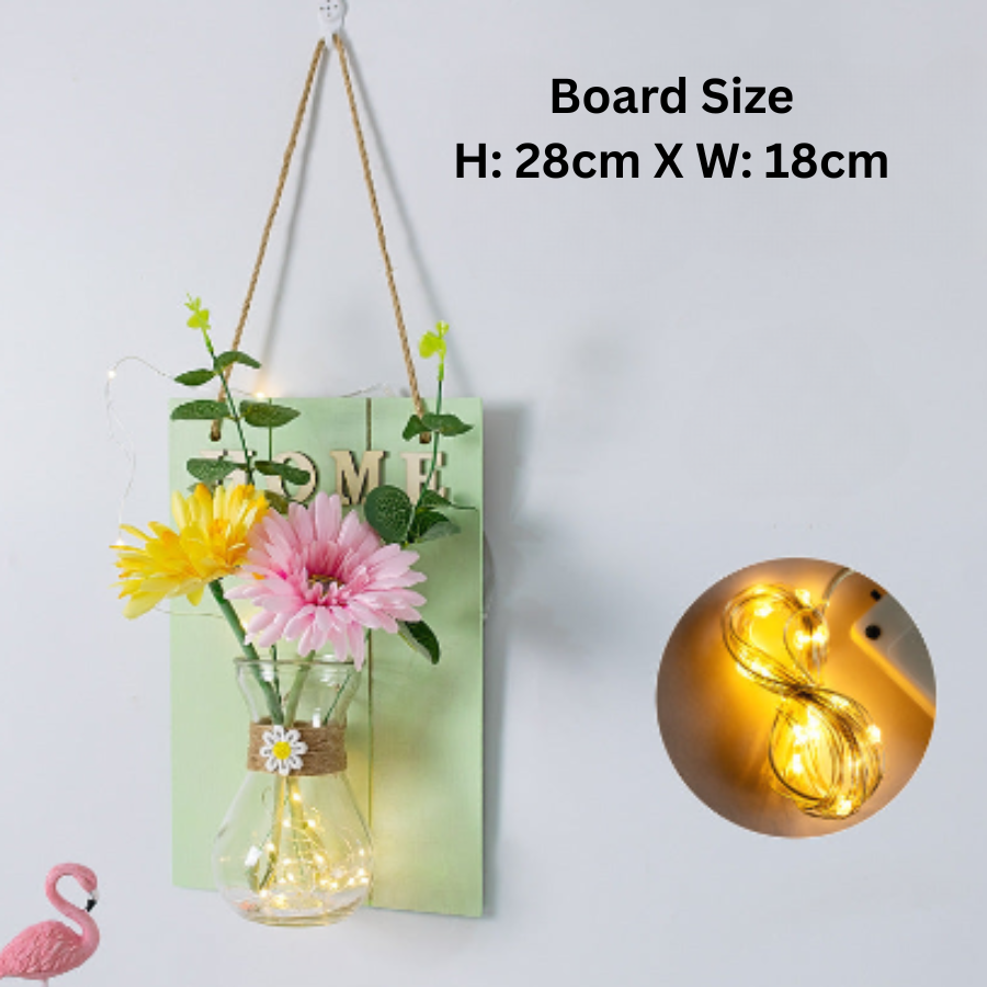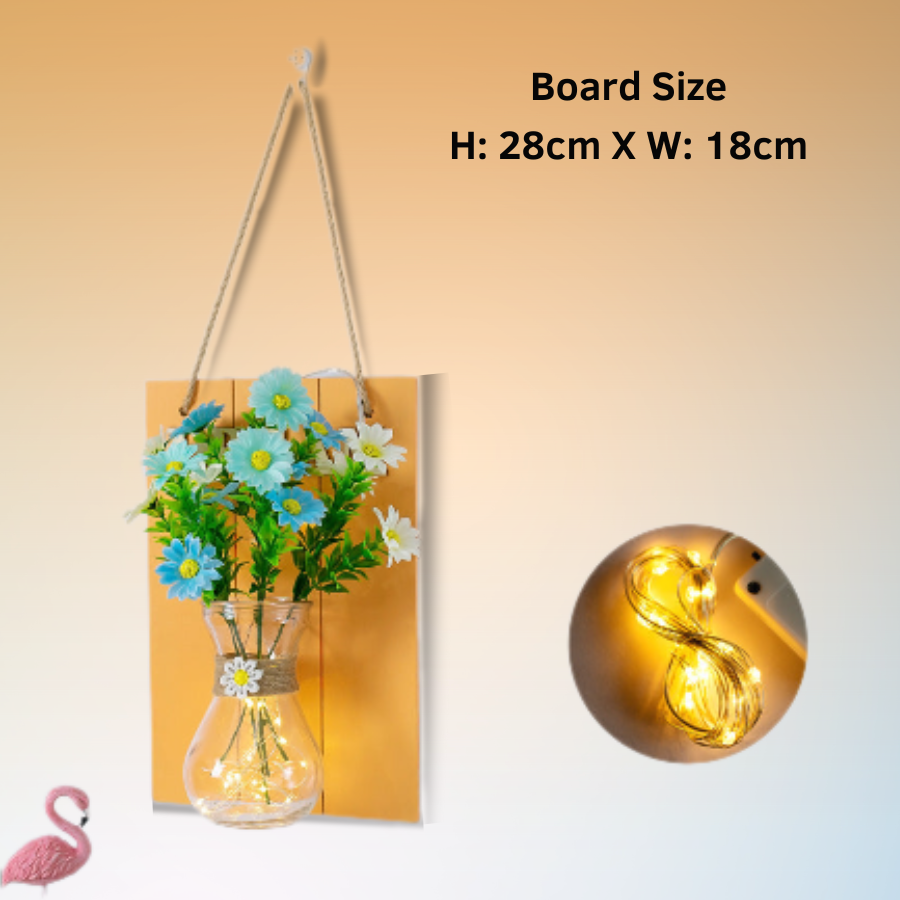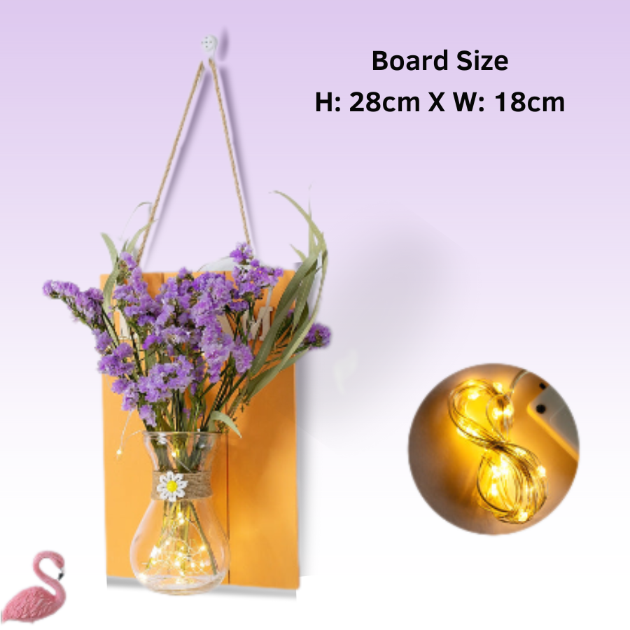 Wall Decoration. Wooden board with vase full of beautiful silk realistic flowers. This product is great for a childs or teens bedroom or a shabby chic room, or even a craft room.