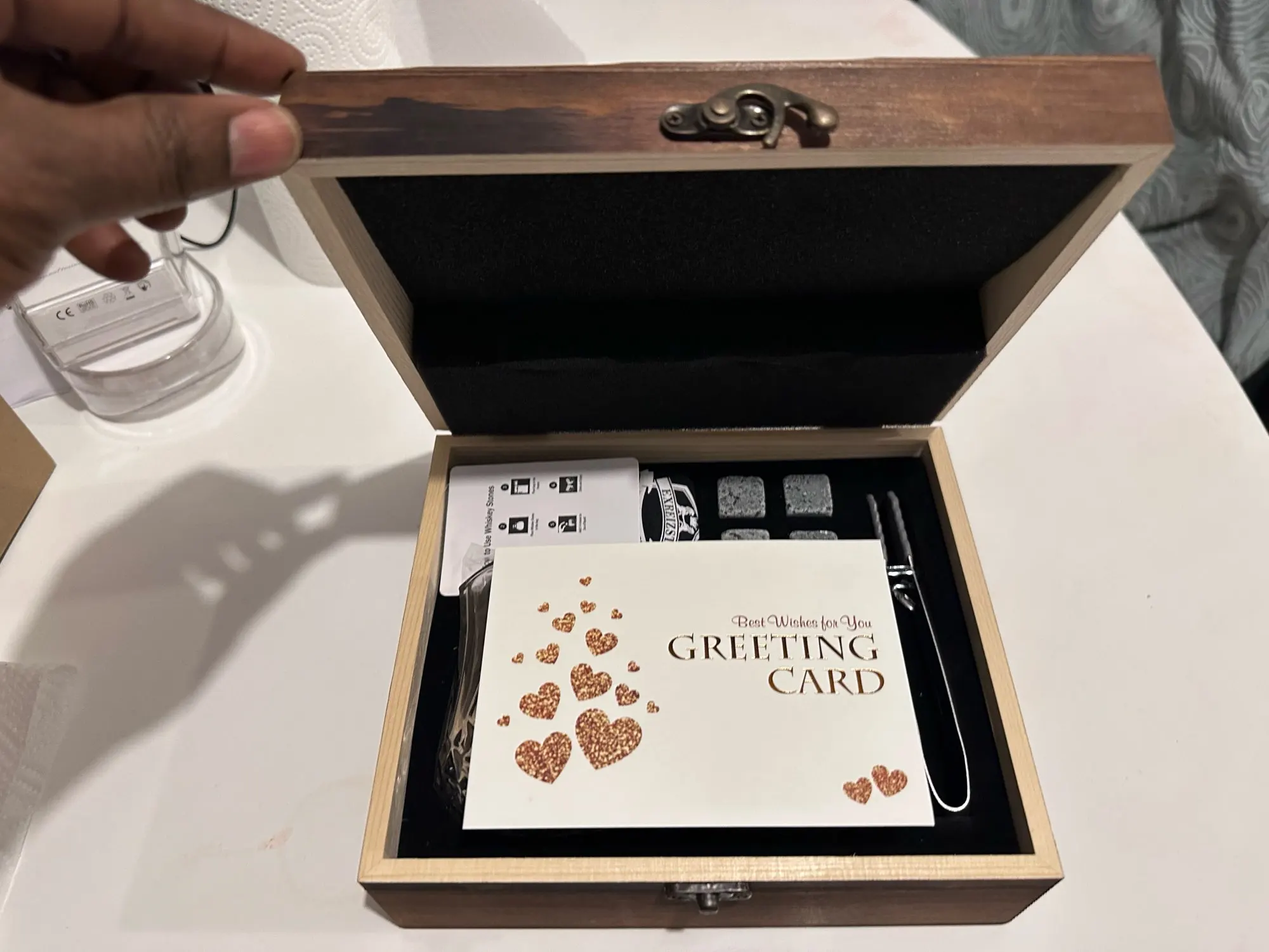 Whiskey Tumbler Set. Two Crystal Cut tumblers with Eight stone ice cubes and Cube Tongs. Comes in a beautiful solid wood display box including a velvet pouch for the stone ice cubes. A perfect gift for a Whiskey Connoisseur.